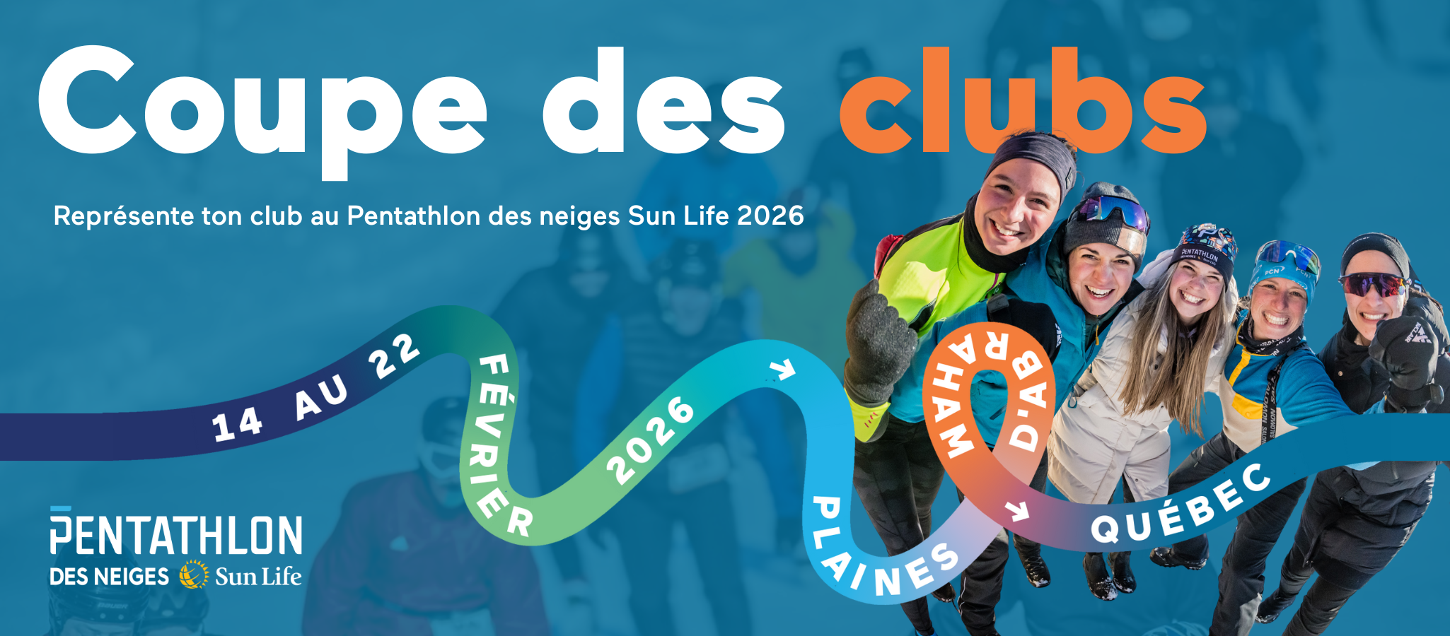 C'est le temps de faire briller votre club! Représentez votre club ou groupe sportif lors du Pentathlon des neiges Sun Life, et courrez la chance de repartir avec un chèque 400$ pour le club et des cadeaux pour vos membres.